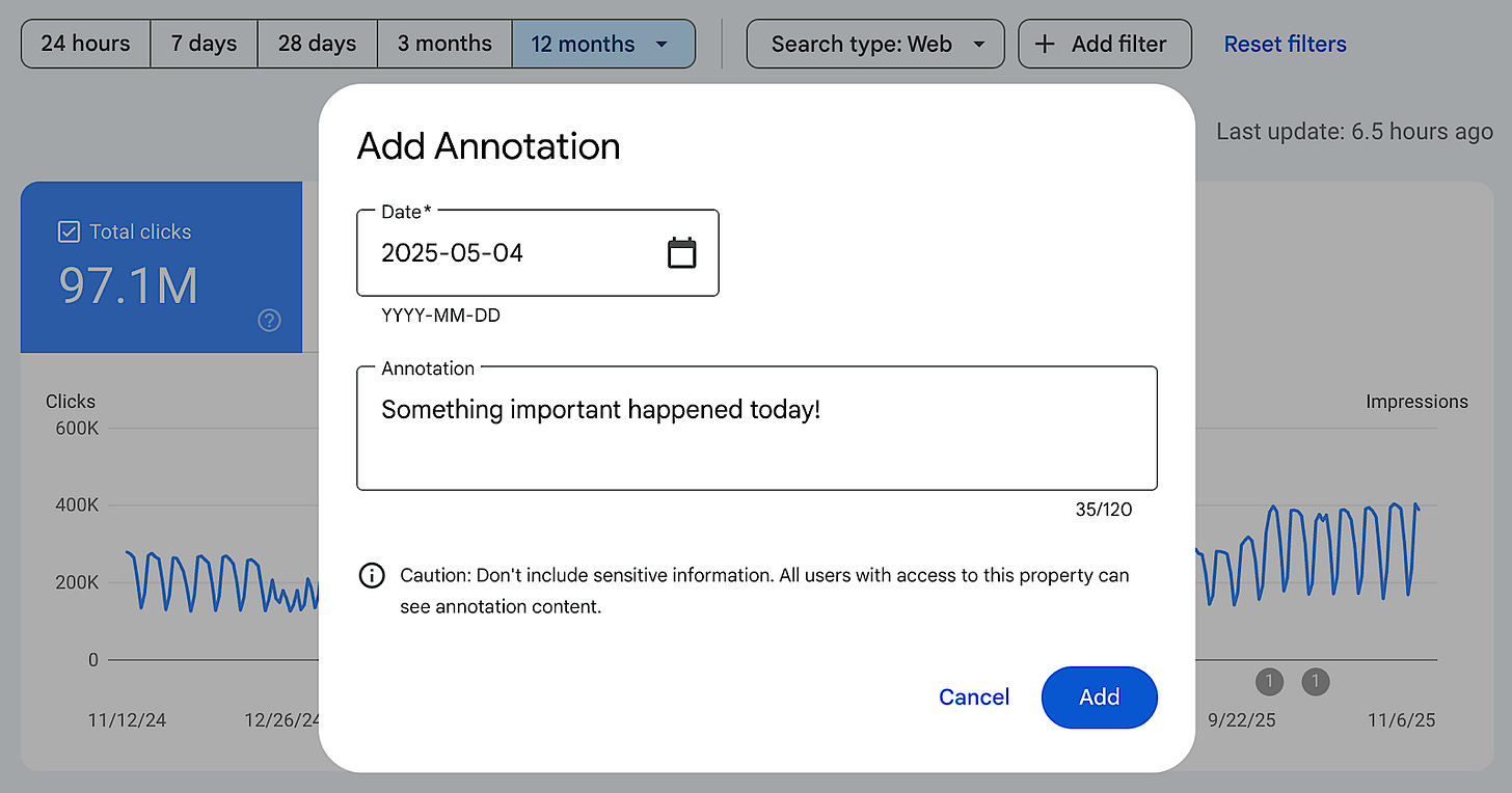 Annotations can help mark when Google’s algorithm updates rolled out, when a site introduced product or design changes, when new site features were added, or when significant news events occurred.