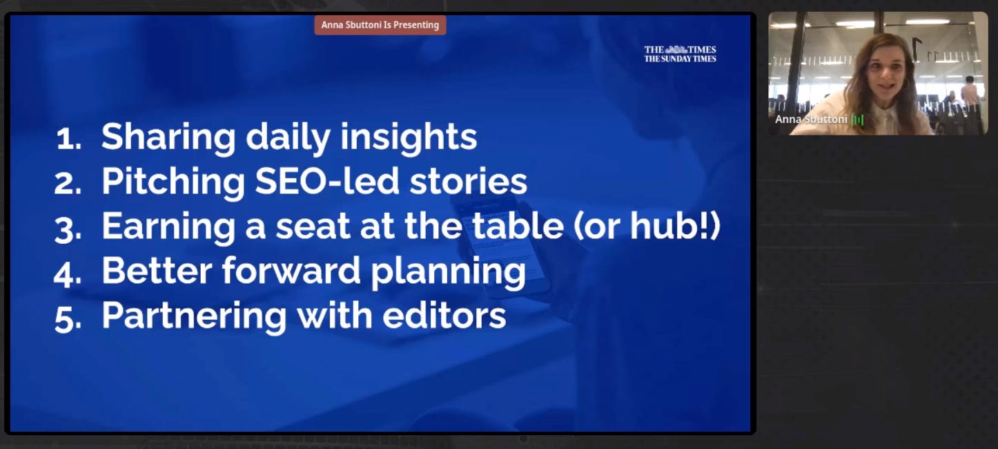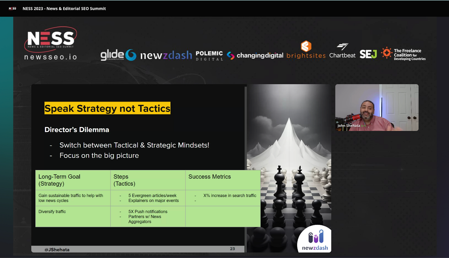 Don’t take a one-size-fits-all approach, John says. It’s important to understand the company’s success metrics, and establish the search goals to achieve those KPIs in a variety of ways. Always speak the right language. In news SEO, that’s how journalists talk instead of SEO jargon. Meanwhile, if your job is a hybrid, or you spend a lot of time discussing goals with stakeholders, ensure you speak the executive’s language and show value in revenue and bottom line numbers. Speak strategy, not tactics, John says. Know your audience when talking about something you’re working on.