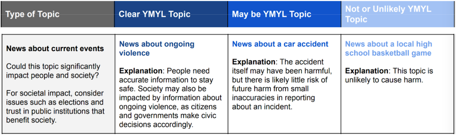 News events are considered against the YMYL spectrum, too. Google’s guidelines suggest that stories about violence are categorized as clearly YMYL, whereas the outcome of a local sporting event is likely not.