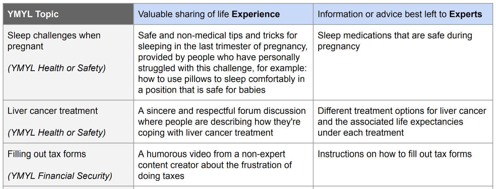The purpose of some YMYL articles will be sharing personal accounts or to learn from the experiences of others. In these instances, Google says pages sharing first-hand life experience on clear YMYL topics “may be considered to have high E.E.A.T as long as the content is trustworthy, safe and consistent with well-established expert consensus.”